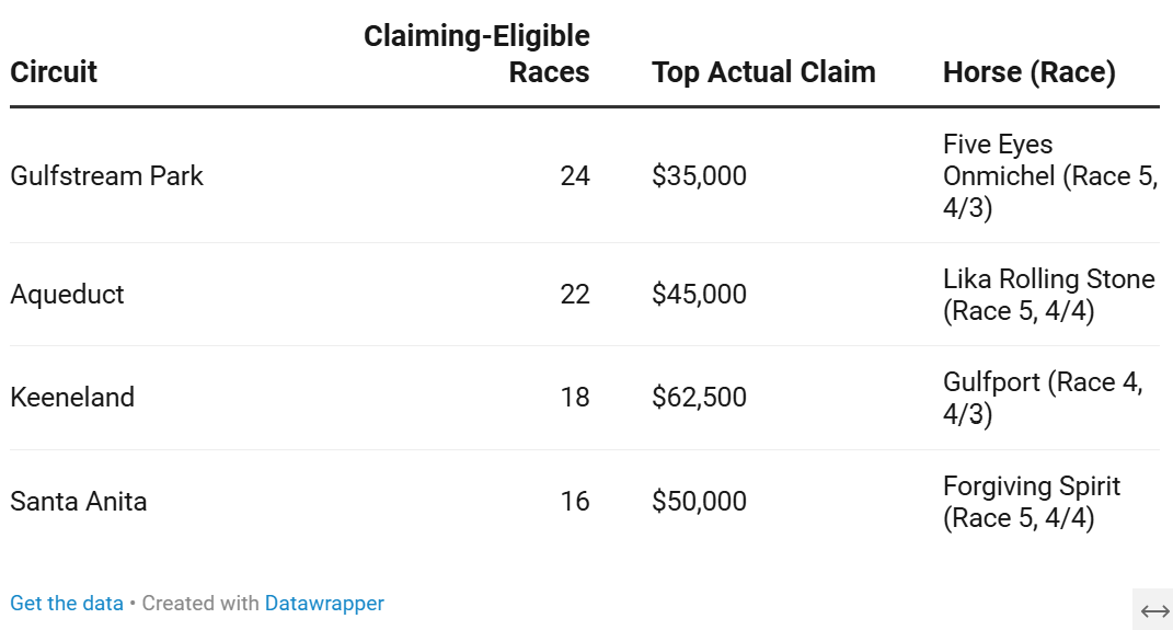 The Keeneland âGulfportâ Strike: Opening Day at Keeneland saw immediate fire in the claim box. Gulfport, a former high-level stakes prospect, was taken for $62,500 in a high-velocity sprint. For the new connections, this is a âBlue Chipâ play: securing an elite pedigree and proven turn of foot just as the lucrative Kentucky spring turf season kicks off.