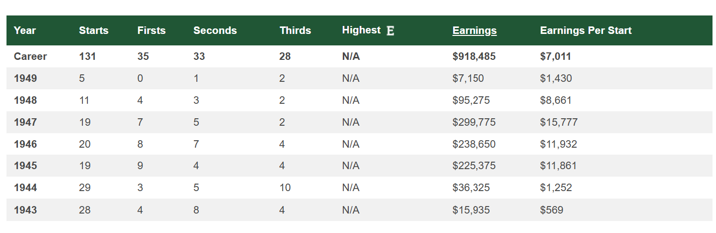 Career Earnings: $918,485 (A world record at the time of his retirement in 1949). That’s more than $7,000 per start, a figure that today would make for a very profitable claimer in most barns.